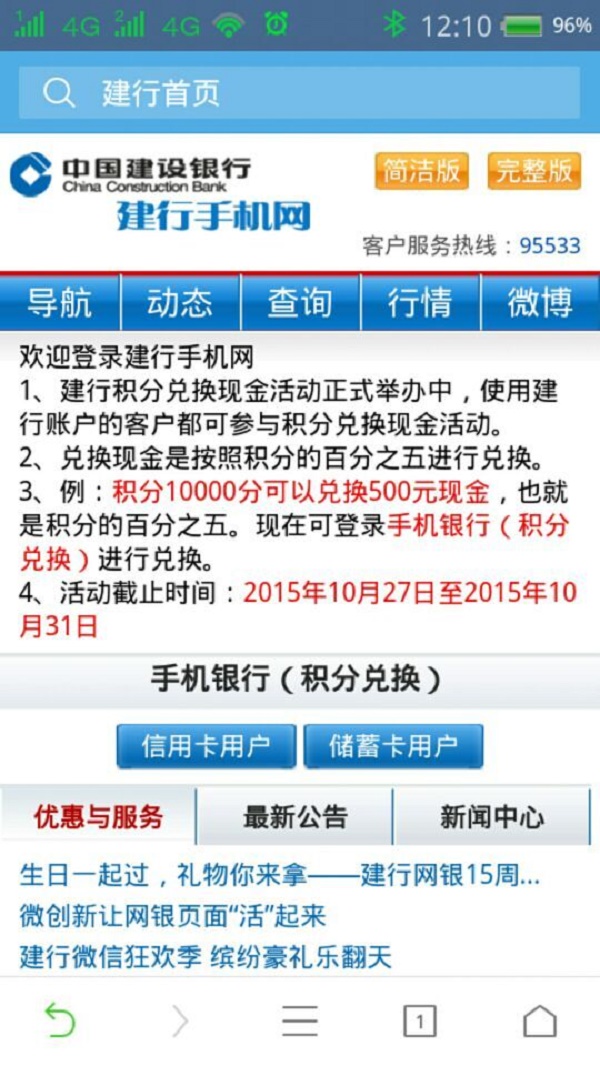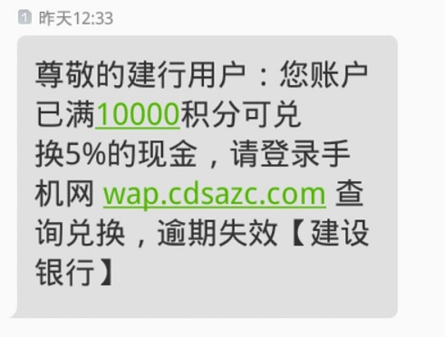 2015年10月31日左右正在临沂接收到“尊敬的建行用户:您账户已满10000积分可兑换5%的现金,请登录手机网 wap.cdsazc.com 查询兑换,逾期失效【建设银行】”此信息的建设银行用户请谨慎此条信息由伪基站,“冒充建设银行官方号码95533”发出并伪造建设银行官方网站,以此盗取用户个人信息和财产。