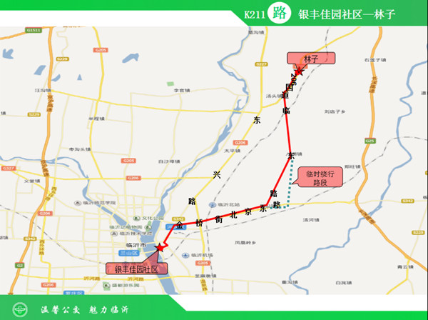K211路由林子发车,按原线路运行至G205国道向南、北京东路向西恢复原线路运营。临时取消停靠平墩湖、新城村、学田村、相公东村、南寺村、大范庄、相公7处站点。