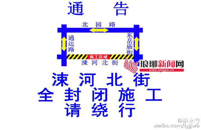 据临沂交警微博消息,自10月26日起至12月21日,临沂市中心城区综合整治工程涑河河道管道施工工程需对涑河北街(通达路至蚂蚱庙街段)全封闭施工,工期57天。为降低工程施工对城区交通造成的影响及保证工程施工顺利进行,根据《中华人民共和国道路交通安全法》等法律法规的规定,决定对施工区域采取限制通行措施,过往车辆可按照以下方式绕行施工路段: