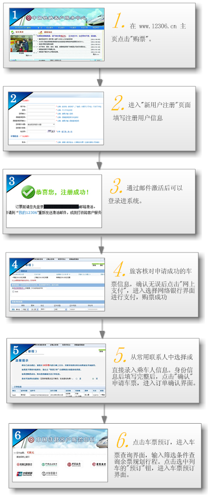1 网上购票是否需要注册?注册需要填写哪些信息? 本网站只对注册用户提供购票服务。 购票人购票前,必须注册为网站用户。注册时需要填写基本信息(必须填写用户名、密码)、详细信息(必须填写真实姓名、证件类型和证件号码)、联系信息(必须填写手机号码和电子邮件)。 2 填写注册信息后是否可以马上订票? 填写注册信息后点击网站发送的邮件激活注册用户后才可以订票。 3 注册可用的有效身份证件有哪些? 注册可用的有效身份证件有:中华人民共和国公民为居民身份证;中华人民共和国香港、澳门、台湾地区居民为港澳居民来往内地通行证、台湾居民来往大陆通行证;外籍旅客为护照。 4 注册用户享受哪些优惠条件? 目前注册用户可以办理购票、改签和退票业务。远期网站将为注册用户提供各项优惠服务。 5 为什么时刻表中有些车次,互联网售票查询不到? 网站仅办理用户进入网站车票预订页面后可以查询预订车次的车票,目前暂时只有京津城际列车、京沪高铁列车和部分途经京沪高铁列车可以网上订票,并未涵盖全国所有车次的车票。并且当某一车次车票销售完后,网站上查询不到该车次信息。 6 网站可订的车票类别有哪些? 目前,网站可订的车票类别为成人票、儿童票、学生票和伤残军人(警察)优待票。 7 网上订票要支付吗? 旅客在网站上申请车票成功后,必须在15分钟内完成网上支付,否则车票信息将被释放给其他旅客使用。 8 网上购票是全天服务吗? 网上购票业务办理时间原则为每日5:00~24:00。 9 网上购票提供哪些功能? 网上购票提供注册、订票、网上支付、订单查询、网上改签、网上退票等功能。 10 网上购票一个身份证可以购多少张票?一笔订单是否有购票张数限制? 一个证件同一乘车日期同一车次限购一张车票。一笔订单不能超过5张票,网站可根据具体情况做适当限制。 11 是否可用自己身份证为他人代购车票? 不可以。购票时必须填写准确真实的乘车人有效身份证件信息。一个证件同一乘车日期同一车次限购一张车票。 12 网上订票成功后,在多长时间内支付可以保留席位? 购票人成功申请到席位后,应当在15分钟内使用具备网上支付功能的银行账户支付票款,否则铁路将取消预订席位。 13 电子客票以什么作为报销凭证? 需报销的旅客乘车前在车站售票窗口、铁路火车票代售点以及自动售(取)票机换取普通车票作为报销凭证。 14 电子客票在车站窗口和代售点如何换成普通车票? 网站上购票时登记的是二代居民身份证的,可以持证到车站售票窗口、安装有二代证识读设备的代售点窗口和自动售(取)票机换取普通车票。 网站上购票时登记的是非二代居民身份证的,可以持证和订单号到任意车站售票窗口换取普通车票。 网站上购买学生票,须凭购票时所使用的有效身份证件和附有学生火车票优惠卡的学生证(均为原件)到安装有学生火车票优惠卡识别器的车站售票窗口或铁路客票代售点换取普通车票。 网站上购买伤残军人(警察)优待票,须凭购票时所使用的有效身份证件和“中华人民共和国残疾军人证”、“中华人民共和国伤残人民警察证”(均为原件)到车站售票窗口换取普通车票。 15 电子客票在自动售(取)票机如何换成普通车票? 在自动售(取)票机换取普通车票时只能凭乘车人的二代居民身份证原件,放在指定位置由机器自动识读换取车票。 16 是什么我不能同时打开两个页面登录订购车票? 在您未完成订单支付前,系统不允许再次查询预订车票。 17 电话订的票能否在互联网上查询、支付? 电话订票系统与互联网售票系统,目前是相互独立的系统,电话订票信息无法在互联网中进行查询和支付。 18 电子客票姓名或证件号码等填写错误,如何处理? 未换取普通车票的在网站上退票后重新购买车票。已经换取普通车票的只能到车站窗口予以说明办理退票后重新购买车票。退票时,按铁路规定收取退票费。 19 我已经预订了车票是否可以更改姓名? 不可以。 20 我的姓名有生僻字如何录入身份信息订票? 姓名中有生僻字用小写的汉语拼音代替。 21 我可以在网上预订后,在车站窗口或代售点支付么? 不可以。在互联网上成功申请席位后,您须在15分钟内使用具备网上支付功能的账户支付票款。 22 国外能够使用互联网订票么? 可以,只要登录12306网站,就可以办理网上订票业务。 23 电子客票是否可以验真? 能成功换票或检票的即为有效的电子客票,不存在真假问题。 24 持电子客票是否可以异地乘车? 旅客持电子票到车票发站乘车,也可以中途上车,但中途上车前必须更换为普通车票。 25 用于购票的身份证件丢失了怎么办? 购票的身份证件丢失,如果来不及补办,按照高铁实名制管理办法,可以到公安制证口办理临时身份证明。 26 互联网订票办理时间范围? 不晚于开车前2小时。 27 我可以在互联网帮助我的朋友购票吗? 可以。购票时可输入您或您朋友的姓名、有效身份证件号码,然后按网站的相应提示办理即可。 28 我的名字是中文和英文组合而成,能办理互联网购票吗? 可以。 29 互联网售票是否可以购买返程车票? 可以。 30 我在查询某一天车票预定信息时,没有车次可以预订,怎么回事? 可能有以下几种情形:该日车票还未开始发售,该日车票已售完,该日已过期。 31 我在网上查到的信息是实时的吗? 按照网页上的相关提示,您可以方便地获