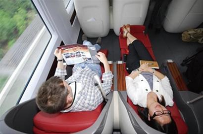 商务车厢内,每排有3个座位,采取2+1布置,每个座椅都配有折叠电视、小桌板、阅读灯等。按动按钮,还能在座、躺之间切换,可实现180度平躺。
