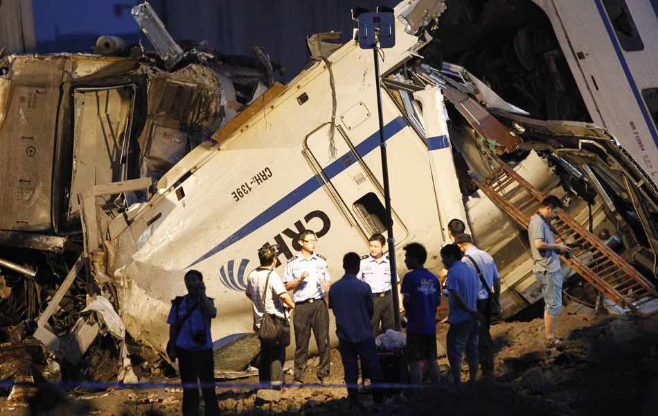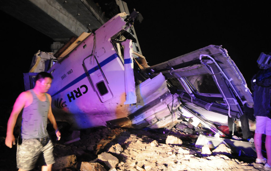 7月23日拍摄的动车追尾脱轨事故现场。 7月23日晚,北京南至福州D301次列车与杭州至福州南D3115次列车在浙江温州境内发生追尾事故。新华社发(小刀 摄)