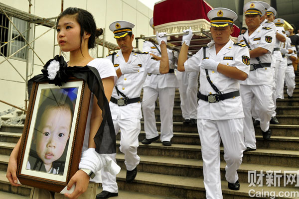 8月1日上午,两岁半的周辰特在“7·23”事故中和其母(陈熙)一起遇难,图为周仁特的爸爸(右三)为其送灵。