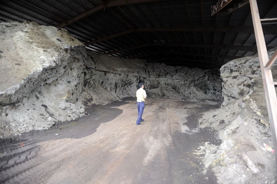 云南省陆良化工实业有限公司总经理助理左国荣告诉记者,这个露天堆放点堆放的铬渣共有28.84万吨,是前任经营者在1989年至2003年间累积遗留下的。以前的处理方式主要是在底下铺好防渗层,再在铬渣堆上盖上一层土。现在他们正在对堆放点进行拦护墙加高工程和防雨工程。8月14日,云南省曲靖市陆良县,化工厂内堆放成山的铬渣堆。