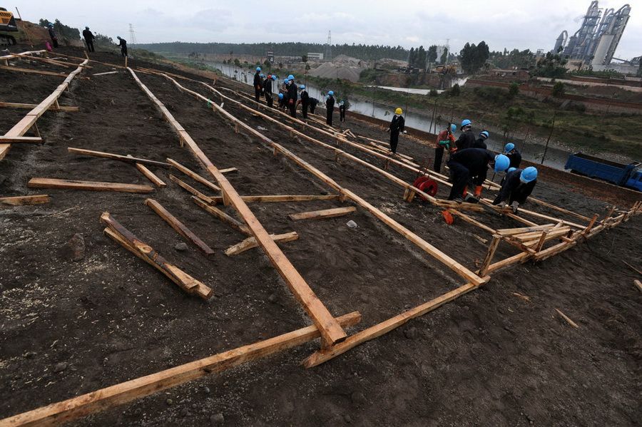 8月14日,云南省曲靖市陆良县,工人为脚下的这28万多吨铬渣“盖房”,这些铬渣紧邻珠江上游的南盘江。