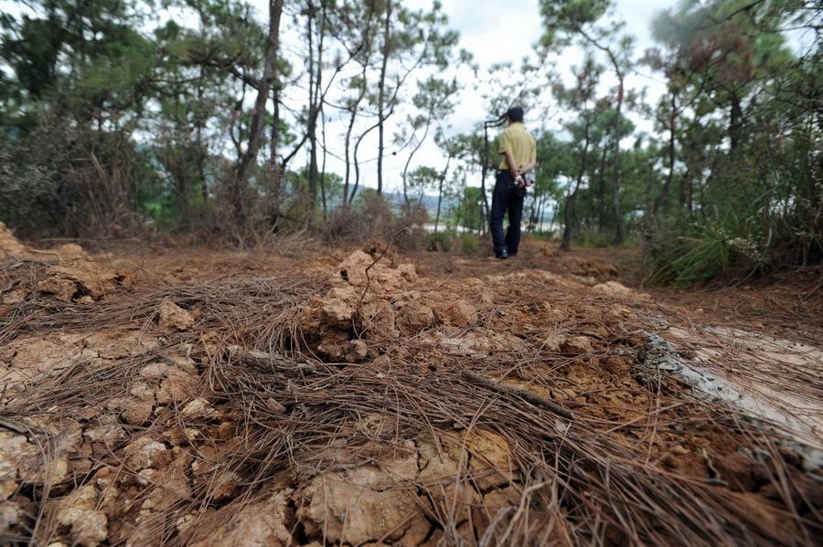 8月14日,云南省曲靖市陆良县,被非法堆放铬渣的地方土壤变灰白,植物枯黄。