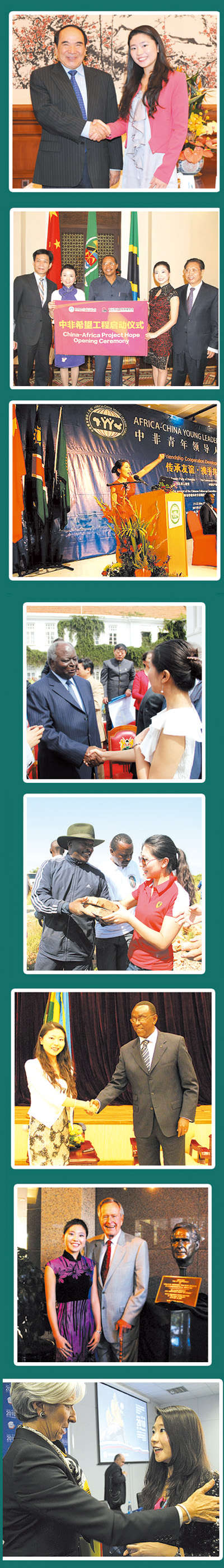 “做我们自己,不随波逐流,走自己的路。中非希望工程是由具备塑造全球未来远见与合作精神的全球青年领袖执行。推动爱心的社会企业家、政府和民间机构携手努力,打造了一个善与美的国际助学合作系统,深受非洲各国喜爱。”