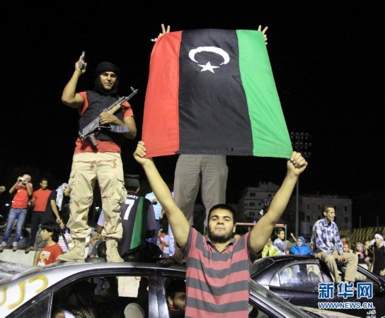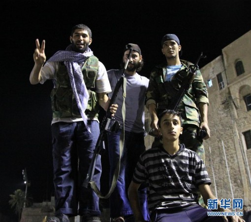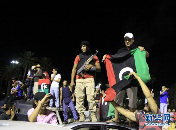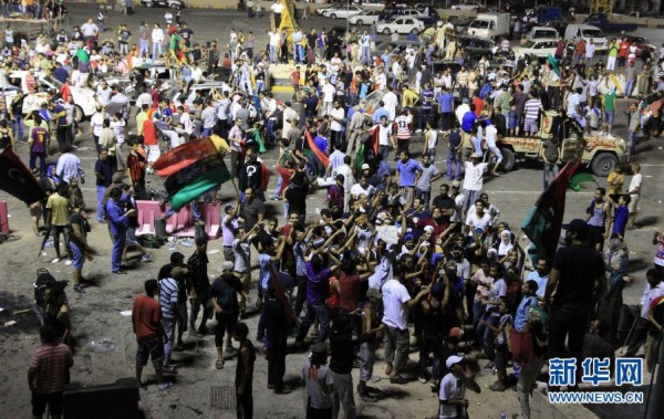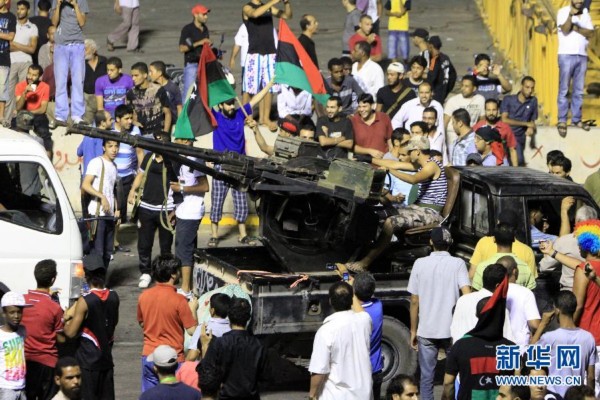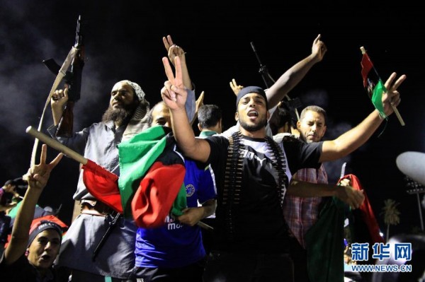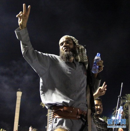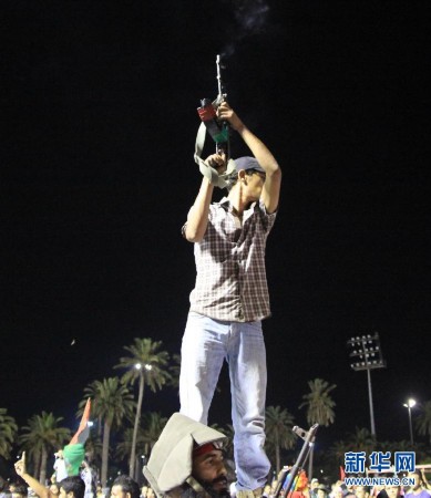 8月23日,反对派武装人员在利比亚首都的黎波里的“烈士广场”(前称“绿色广场”)庆祝。经过一天激烈战斗,利比亚反对派武装在当地时间23日傍晚攻入的黎波里的阿齐齐亚兵营,占领了卡扎菲在兵营内的住处,但并未发现卡扎菲的踪迹。