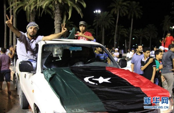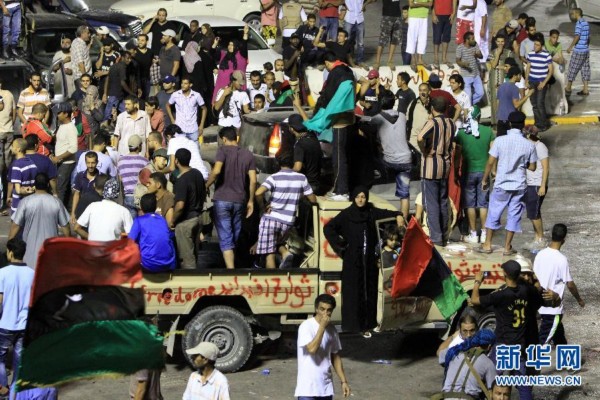 天空电视台记者报道说,有人撕毁、纵火焚烧印有卡扎菲肖像的海报,有的比出“胜利”的手势,并高喊口号。