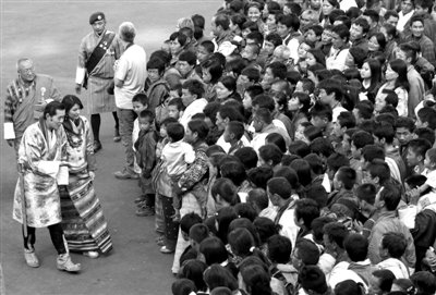 13日,国王与皇后与到贺的当地村民见面。 13日,喜马拉雅山脚下的佛国不丹迎来举国大事件。被称为“世界最年轻、最英俊国王”的吉格梅·凯萨尔·纳姆耶尔·旺楚克,将小自己十岁的平民女子佩玛娶为皇后。这是自1988年,该国首次举行皇室大婚。不过,与20多年前旺楚克的父王大婚时不一样,不丹已经发生了从专制到民主的变革。而这次大婚,旺楚克夫妇也没邀请任何一位权贵豪门,庆婚的,都是当地的村民。 13日,这场世纪婚礼在不丹旧都普那卡市举行,并通过电视直播。婚礼采取传统佛教仪式,在不丹最古老的西姆托卡宗寺庙中举行。 占星师算出良辰吉时 这场婚礼轰动了仅有695万人口的不丹,之前,人们对31岁仍未婚的国王很是担忧,因为国王必须要拥有一个完整的家庭。当婚礼消息宣布后,儿童们作诗排练舞蹈赞美婚礼,国王和王后的海报也随处可见。 婚礼在早上8:20开始,这个时间是由占星师算出的吉时,旺楚克国王身披黄色的绶带,头戴红色的绘有乌鸦的王冠,乌鸦在不丹是国王的保护神。旺楚克缓缓步入西姆托卡宗寺,并登上楼梯进入内庭。紧接着,他的21岁的新娘,跟随在一队僧侣和举旗者的后面,也进入内庭。歌手们随着鼓点节奏的变化咏唱歌曲。新王后穿着传统的贴身长裙,并外带一件金色夹克。 在内庭,站立等待的是不丹的高级神职人员,他们是婚礼主持人员,为这一对新人“净化灵魂”并送去祝福。 当这对新人进入寺庙几分钟后,旺楚克的父亲也进入寺庙,西姆托卡宗寺庙在不丹是禁地,只有国王和高级神职人员才能进入。 老国王赠送镜子炼乳 老国王将一组五色的丝巾交给新娘,这代表着寺庙的祝福。接着新娘手托盛满美酒的金色高脚杯——这杯酒象征着来世的永生,慢慢走进国王,国王也缓缓走下王座。 王座正对着一座巨大的佛像,旺楚克先接过酒杯一饮而尽,然后给他的皇后加冕了一顶精美的织锦缎后冠。随后,新王后落座在国王旁边。老国王向他们赠送了不丹婚礼传统礼物,包括镜子、炼乳、牧草和贝壳,这些都代表了长寿、睿智、纯洁和其他美好祝福。此时,僧侣们开始奏起欢快的音乐,喇叭鼓声齐鸣。 几千村民成唯一嘉宾 这场皇室婚礼,并不像威廉王子的大婚那样广邀全世界皇室成员以及名流政要。旺楚克一直要求典礼简单传统,因此没有任何外国贵宾或王室受邀。参加婚礼的,只有国王的家人和几千当地村民,而其余的不丹人则通过电视来分享国王的喜悦。由于座位不足,内阁部长也被劝不要带妻子出席婚礼。 婚礼后,国王难掩喜悦之情,他对记者说, “我等待这一刻已经很久了,我终于找到了能相伴一生的人……对我来说,王后是一个完美的人,聪明美丽,我们有很多共同爱好,我们都对艺术痴狂”。 旺楚克是不丹第五代国王,其父亲在2008年自削百年王权,在不丹推行民主制度。旺楚克于同年继位,成为不丹推行君主立宪制后首任国王。 ■ 恋爱史 “等你长大了,我便娶你” 旺楚克17岁时,便向佩玛求婚;佩玛是飞行员的女儿,当时仅7岁 “等你长大了,我便娶你”,14年前,一位年轻的王子,跪在地上,向一名7岁的女孩求婚。这位王子,是旺楚克,而当时那位7岁的女孩,如今已经成为倾国倾城的不丹王后。 不丹官方习惯称佩玛王后为平民王后,而一般人对佩玛也知之甚少,只知她在篮球场上身手矫健、年龄甚轻以及倾城美貌。 佩玛出生于不丹首都廷布的一个官员家庭,祖上曾为不丹的一个地区总督。她的父亲是航空公司飞行员。佩玛母亲家族则和皇室颇有渊源,是现任国王叔祖父的教女。虽然与皇族有渊源,但佩玛一直称自己是平民而非贵族。佩玛是家中第二个孩子,在廷布一所大学毕业后,留学英国、目前正在攻读国际关系学位。 因美貌和与国王的关系,佩玛很受民众爱戴。佩玛喜欢打篮球,在大学时还是校队队长,即便到现在仍保持了“不凡身手”。除此之外,佩玛非常摩登,在大学期间还组织乐队和舞蹈队。 旺楚克国王对佩玛可谓一见倾心,即便当初她只是一个7岁的小女孩。据悉,佩玛7岁那年,在一次郊游中邂逅了17岁的王子旺楚克。而旺楚克每每谈及此事,都不禁忆述当年“求婚”情景。旺楚克说,他当时下跪向佩玛求婚,称“等你长大后,我便娶你”。 此后,旺楚克甚至在公开场合也挽着佩玛的手大秀恩爱。佩玛和旺楚克都很喜欢艺术和摄影,佩玛最喜爱文艺复兴时期的艺术和现代艺术,也十分钟情传统文化,对不丹古代音乐很精通。 ■ 施政 亲民国王走村镇推改革 旺楚克走遍不丹大部分国土,亲自鼓励民众参与民主实践 “世界上最年轻的国王”、“最英俊的国王”——生于1980年的旺楚克有很多美誉。但是,这位年轻的国王给不丹带来的最大影响,还是他继承自己“父王”的政治理念——自削王权,推动民主。 旺楚克的父亲——吉格梅·辛格·旺楚克1972年继位,2008年,他将自己的王位传给旺楚克。同一年,在老旺楚克的主导下,该国历史上首届民主选举也正式举行,结束了不丹持续百年的君主专制。旺楚克继位时,父亲对其带领不丹民众实践自己的民主理念寄予厚望。 旺楚克是辛格·旺楚克众多子女中的长子,同父亲一样,旺楚克有在西方国家留学的经历。他先后在美国、英国留学,获得牛津大学外交和国际关系硕士学位。 回国继位以后,旺楚克面临的最大挑战,是让从不知民主为何物的不丹民众接受一种崭新的制度。为此,旺楚克走遍了