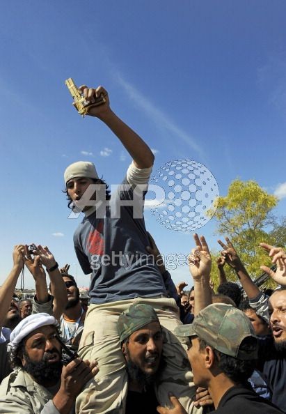当地时间2011年10月20日,利比亚苏尔特,利比亚过渡委士兵展示从卡扎菲身上缴获的金手枪。