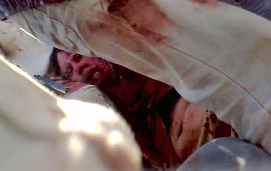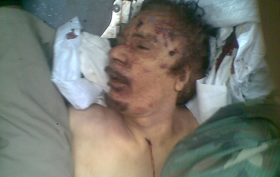 当地时间10月20日,法新社公布卡扎菲在苏尔特重伤被俘的照片,照片由手机拍摄,卡扎菲稍后伤重死亡。