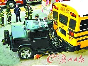当悍马(左)撞上美国校车,悍马惨不忍睹,校车几乎安然无恙。转自《南京日报》