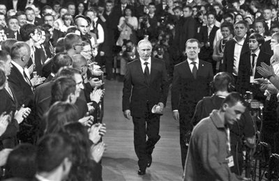 27日,莫斯科,“统一俄罗斯”党代表们起立欢迎梅德韦杰夫和普京出席该党会议。新华社发