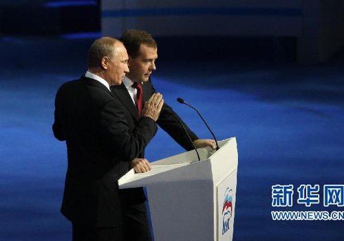 11月27日,在俄罗斯首都莫斯科,俄罗斯总统梅德韦杰夫(右)与总理普京在俄罗斯执政党统一俄罗斯党的代表会议上共同在台上发言。新华社发(卡瓦廖夫摄)
