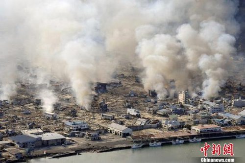 北京时间3月11日13点46分,日本本州岛附近海域发生里氏9.0级地震,震中位于宫城县以东太平洋海域,图为3月12日,遭受地震袭击的岩手县山田镇冒起滚滚白烟。