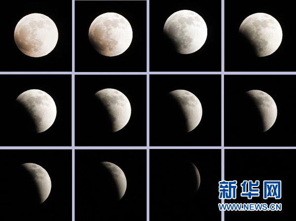 这是12月10日晚在北京故宫拍摄的月亮从初亏到食既的过程(拼图照片)。 当日,我国上演10年来观测条件最好月全食。 新华社记者邢广利摄