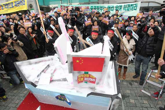 “韩国自由总联盟”等市民团体14日在中国驻韩大使馆前举行集会示威。部分韩国人手持棍棒敲碎了一具象征中国渔船的模型。