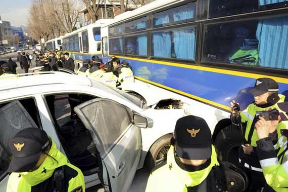 一名韩国青年企图驾车冲击中国使馆,结果撞在使馆大门前充当屏障的韩国警察大巴上,驾车人重伤