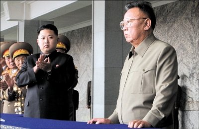 2010年10月10日,朝鲜在平壤金日成广场举行盛大阅兵式,庆祝朝鲜劳动党成立65周年。金正日(右一)等朝鲜党和国家领导人在阅兵式开始前走上主席台。新华社发
