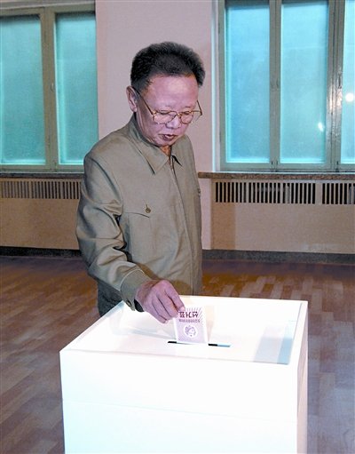 朝鲜中央通讯社2009年3月8日提供的照片显示,金正日在平壤一处投票站投票。新华社/朝中社