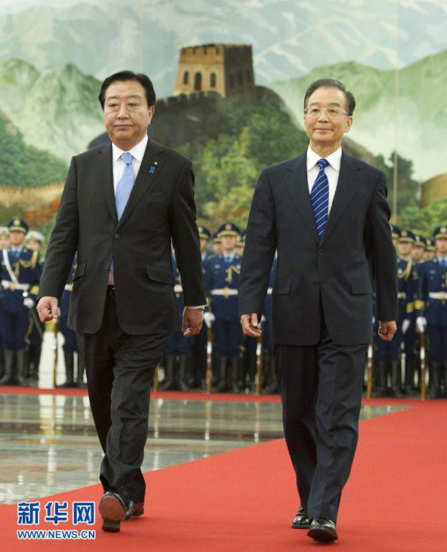 这是会谈前,温家宝为野田佳彦访华举行欢迎仪式。