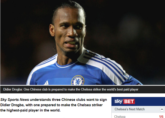 英国媒体《天空体育》网站截图:一支中国球队给德罗巴提供世界第一高薪