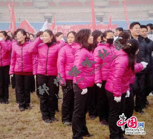 公务员方阵穿着统一配发的新羽绒服