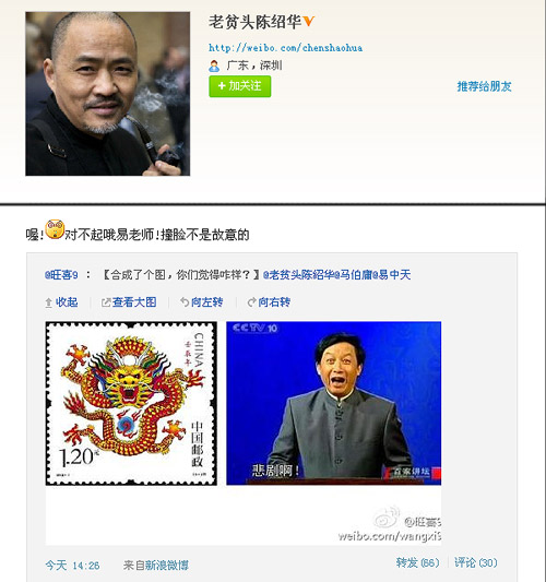 “喔!对不起哦易老师!撞脸不是故意的”,针对着一位网友合成的2012年生肖龙票与易中天的合成照片,著名平面设计师、2012龙年生肖邮票的设计者陈绍华风趣地在其官方微博上回答。(图1为陈绍华微博页面的相关截图)