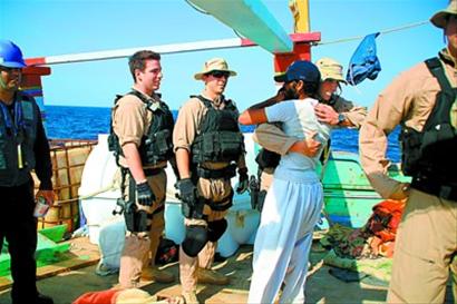 这张美国海军6日公布的照片显示,被索马里海盗劫持的伊朗船员与解救他们的美国“基德”号导弹驱逐舰上的美军士兵拥抱。新华社/路透