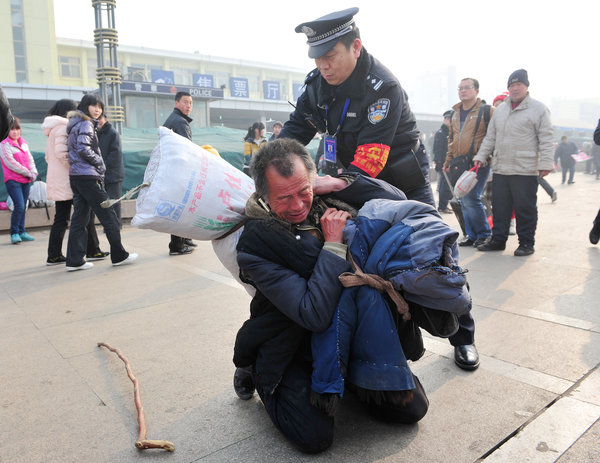 2012年01月08日,山西省太原市,民警帮跪地的老人扛上行李并扶起老人。马立明/CFP