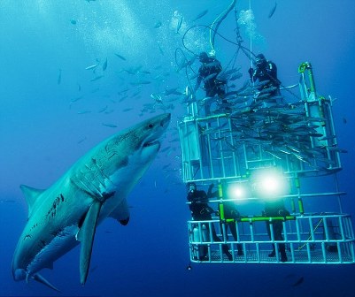 利奇菲尔德等两人为了近距离拍摄大白鲨的照片,竟然不惧危险站到了水下防护笼的顶部。