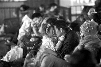 1月11日,北京西站,一对父女在候车室等待验票上车。本报记者周岗峰 摄