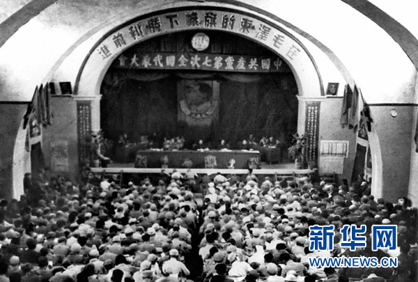 这是中国共产党“七大”会场(资料照片)。 1945年4月23日至6月11日,中国共产党第七次全国代表大会在陕北小山村——杨家岭召开。毛泽东在会上致开幕词和闭幕词,并作了《论联合政府》的政治报告。七大确定了党的政治路线,确立毛泽东思想为党的指导思想并写入党章。七大总结中国新民主主义革命20多年曲折发展的历史经验,克服党内的错误思想,使全党特别是党的高级干部对中国民主革命的发展规律有了比较明确的认识。它为党领导人民去争取抗日战争的胜利和新民主主义革命在全国的胜利,奠定了政治上、思想上和组织上的深厚基础。新华社发