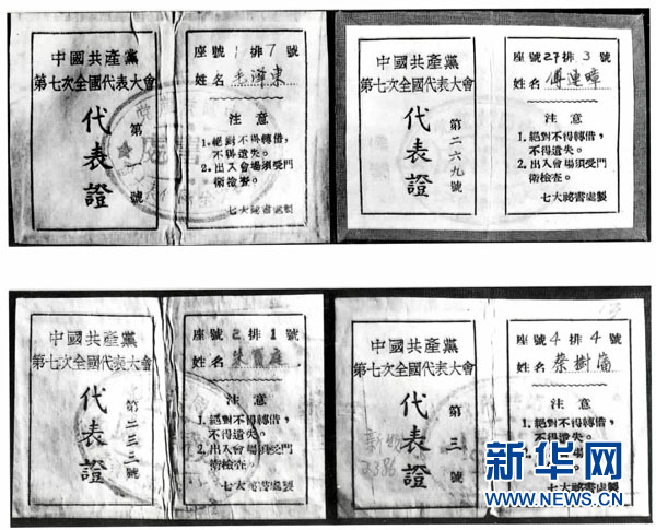 这是中共“七大”代表毛泽东等人的代表证(资料照片)。 1945年4月23日至6月11日,中国共产党第七次全国代表大会在陕北小山村——杨家岭召开。毛泽东在会上致开幕词和闭幕词,并作了《论联合政府》的政治报告。七大确定了党的政治路线,确立毛泽东思想为党的指导思想并写入党章。七大总结中国新民主主义革命20多年曲折发展的历史经验,克服党内的错误思想,使全党特别是党的高级干部对中国民主革命的发展规律有了比较明确的认识。它为党领导人民去争取抗日战争的胜利和新民主主义革命在全国的胜利,奠定了政治上、思想上和组织上的深厚基础。新华社发