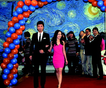 由于公司从事的是出国留学教育行业,员工大多是70后、80后的年轻人,平时就特别爱搞怪、有创意,怎么才能出其不意,给大家一个大大的开场惊喜呢?年会的策划团队集思广益,最后确定要在开场前来个各大颁奖礼都有的“红毯秀”,让大家沿着红毯走上星光大道,然后在用所有同事的笑脸拼成的“笑脸墙”上签名留念。