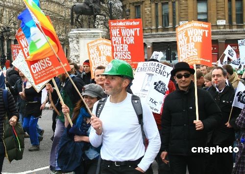 资料图:当地时间2009年3月28日下午,数万示威者在伦敦街头游行,要求参加伦敦峰会的G20领导人“以人为本”“公正行动”,解决贫困、就业和环境变化等问题。图为工运组织抗议资本主义带来危机。