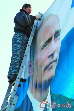 16日,一名俄男子正在张贴大幅普京竞选海报。