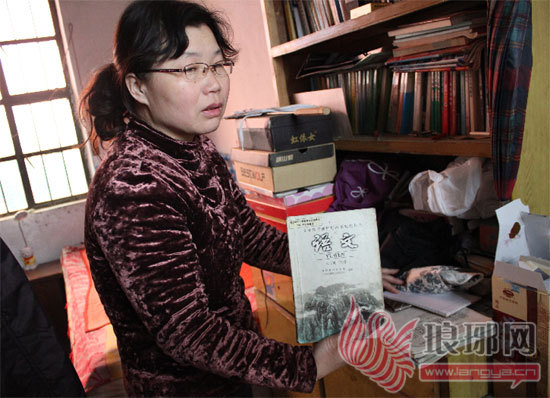 李志强的妻子拿着他生前授课用的语文课本,神情悲伤。