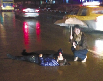 这到底是怎么样的画面?其实内容很简单:潮湿的路面上,一名中年妇女,倒在马路中央,看上去遭遇了车祸。一名戴着眼镜的年轻女子,蹲在她身旁,撑着伞……