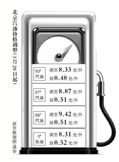 记者从两大石油公司北京分公司获悉,价格调整后,北京市93#京标汽油最高零售价也首度超过了8元整,调至8.33元/升,上涨了0.48元/升(调价前7.85元/升),正式进入“8元”时代。97#京标汽油最高零售价调至8.87元/升,上涨了0.51元/升,98#京标汽油价格上涨了0.51元/升,达到9.42元/升,首次进入“9元”时代,也逼近了10元/升,0#柴油价格调至8.31元/升,上涨了0.52元/升。