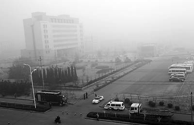 去年12月20日清晨,雾中的胶州法院周边戒备森严。弋雍摄