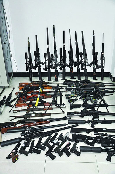 右图:警方查获的各类非法枪支足以武装一个“加强连”。