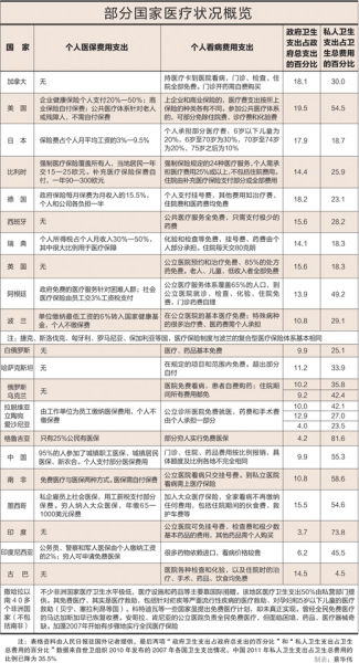 根据《2010中国卫生统计年鉴》的数据,在全世界193个国家的卫生费用支出中,个人卫生支出为零的国家一个也没有,也就是说,没有一个国家个人看病是不花钱的。人们平日认为免费医疗的国家,如英国、日本、美国、印度等,2007年个人卫生支出占卫生总费用比例分别为18.3%、18.7%、54.5%、73.8%。中国的个人占比在2001年时为60%,到2011年下降到35.5%。