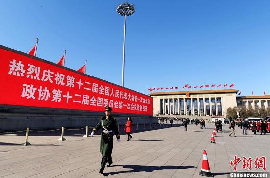 3月4日,北京晴空万里,武警从北京天安门广场大型显示屏前走过。3月5日上午,十二届全国人大一次会议将隆重开幕。中新社发 刘忠俊 摄