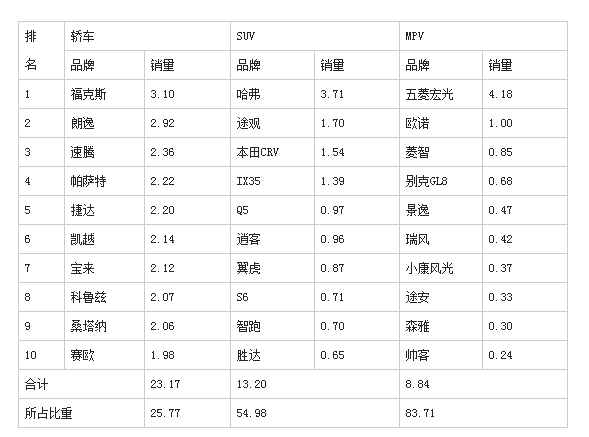 表1 2013年8月乘用车分车型前十位品牌销量排名 单位:万辆、%