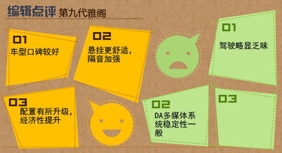 全新雅阁在外型上继承了第八代雅阁的基本风格,沉稳大气依然占据着主要基调。内饰变得简约化,还加入了电子手刹、双触摸屏等时髦的配置,空间也继续保持着同级车的优势地位。综合而言,新一代雅阁没有让人印象太深刻的地方,但从外观到内饰再到动力,都让人挑不出什么毛病,我觉得这其实是对它最大的褒奖,也是那些偏科生做不到的。