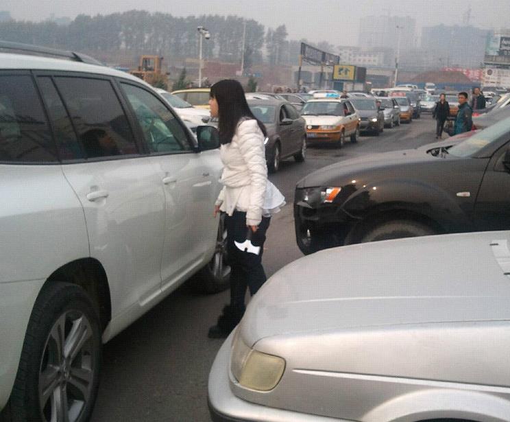 2013年10月20日11时许,在长春欧亚卖场十号门外的停车场通道里,一名年轻女子驾驶一辆灰色丰田轿车由东向西行驶,与一辆由西向东行驶的白色丰田越野车迎面会车。越野车没有避让,往前抢了一下,险造成两车刮碰。女子停车后下车和越野车司机理论,还从车里拿出了一把刃口明晃晃的斧子,一手持斧子,一手不停拍打对方右前侧车门,并且和对方争吵。当时双方车上都有老人,而越野车里还有孩子,吓得哇哇直哭,越野车司机怕出事,就一直没下车也没开车窗。