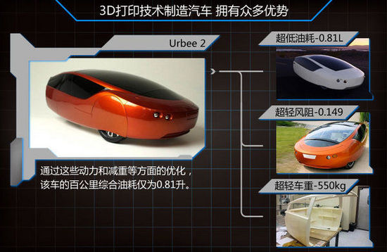 此次由三家公司倾力合作推出的3D打印汽车名为Urbee 2,车身和内饰材料均由3D打印制造。该车是一款三轮两座的小车,并由一个后轮进行驱动。在动力系统方面采用的油电混合动力系统,其中两个前轮均由一对36V的电力马达驱动,提供最高12kW的动力。低速时将由电动机完全驱动,高速行驶时将通过柴油发动机驱动,规划最高时速可达110km/h。电池通过Urbee2车顶的太阳能面板进行充电,从而最大程度节省燃料消耗。