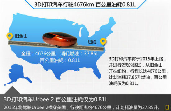 这款3D打印技术制造的新车将于2015年试验上路,并由加拿大KOR Ecologic设计团队将驾驶Urbee 2横穿美国,行驶距离约4676公里,计划耗油量为37.85升。在证明燃油重要的同时,也将有利于对这款3D打印技术制造的新车进行宣传。